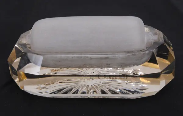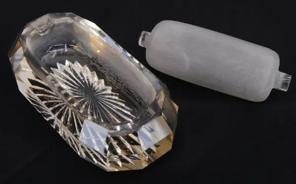 En frimärks-och etikettfuktare av glas i två delar bestående av skål samt rulle. Rektangelformad skål med fasettslipat glas. Nedsänkningar i vardera ände av skålen med plats för fuktrulle. Botten med ...Visa hela