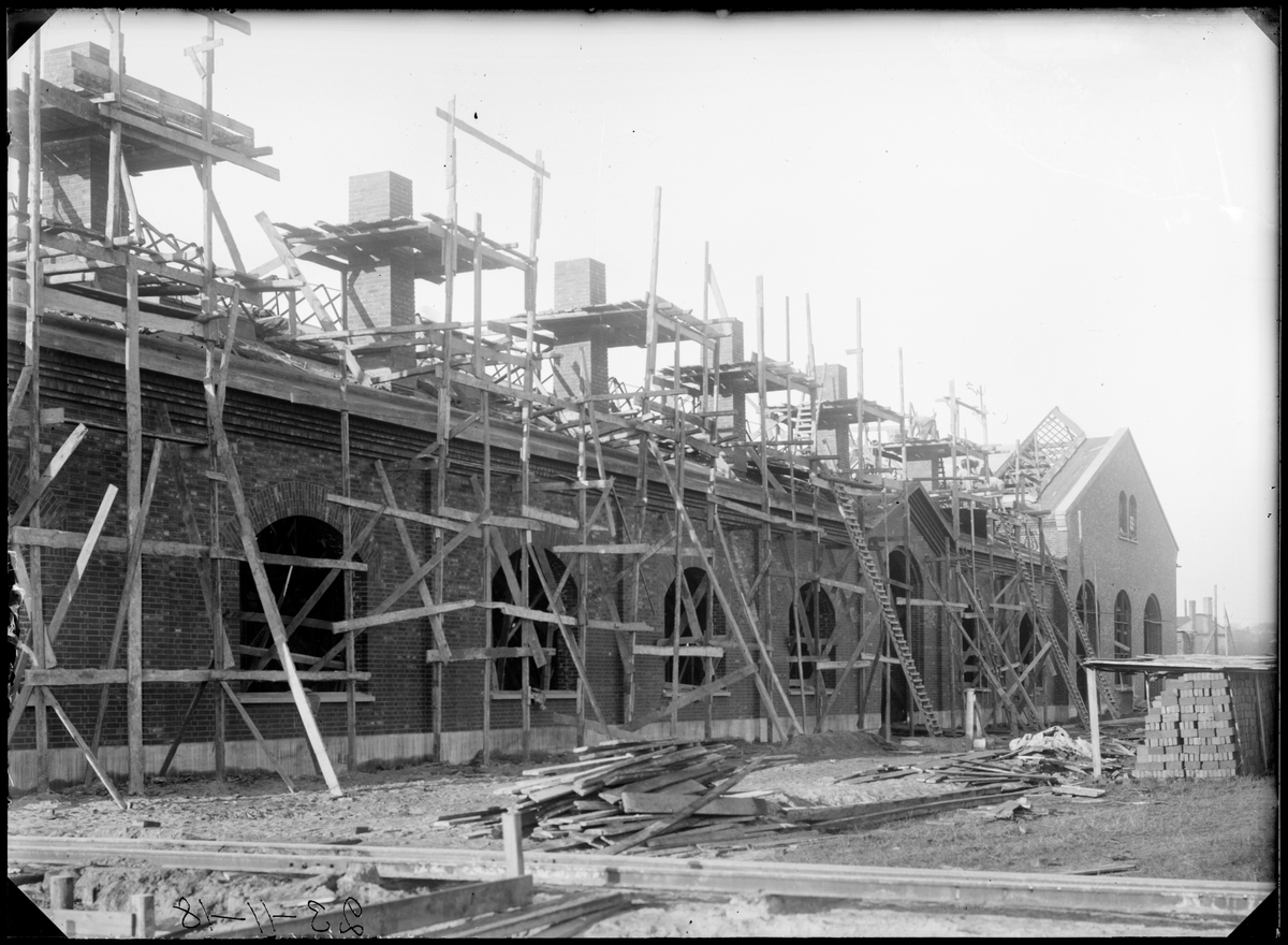 Byggnation av vagnverkstaden vid Statens Järnvägars Järnvägsverkstäder i Kirseberg, Malmö.