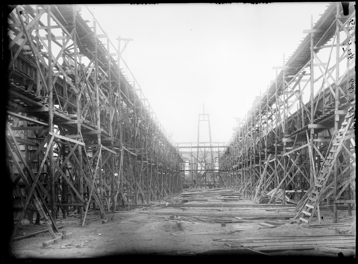 Byggnation av lokverkstaden vid Statens Järnvägars Järnvägsverkstäder i Kirseberg, Malmö.