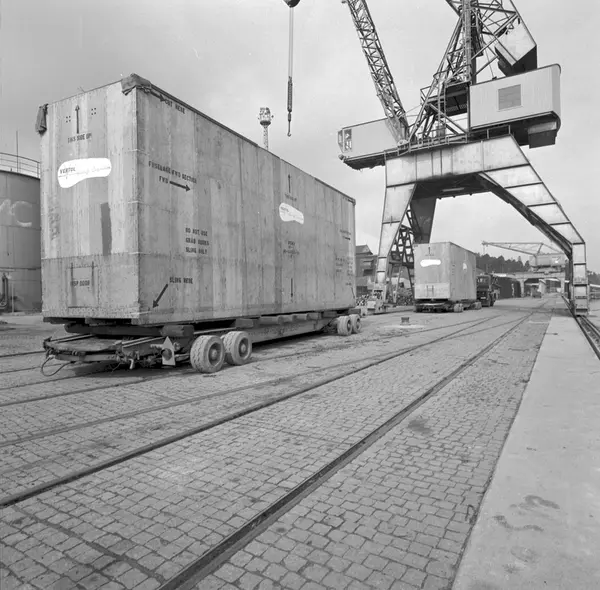 Helikopter i emballage lastad på låglastande släpvagn, vagnbjörn