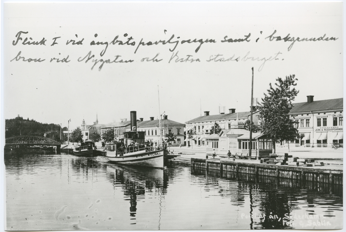 • Söderhamn. Flink I vid kajen nära ångbåtspaviljongen med" järnbron " i Nygatan och västra stadsberget i bakgrunden.