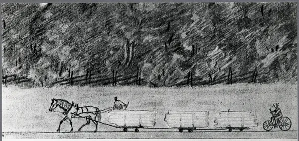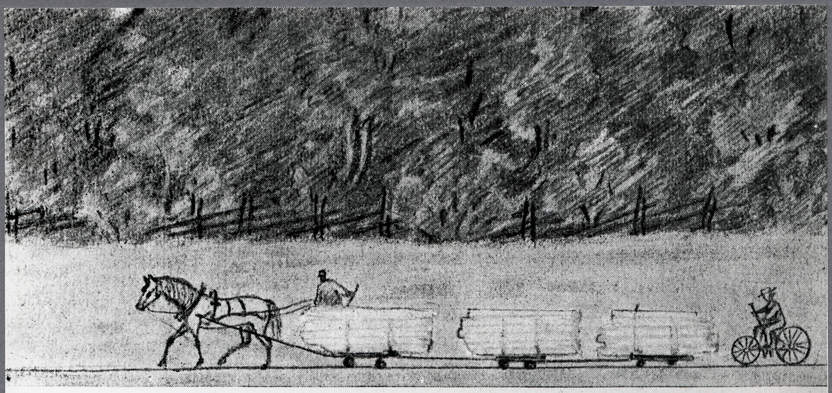 Teckning av Robertsfors-Sikeå hamns Järnväg med timmerlast och dressin på.
