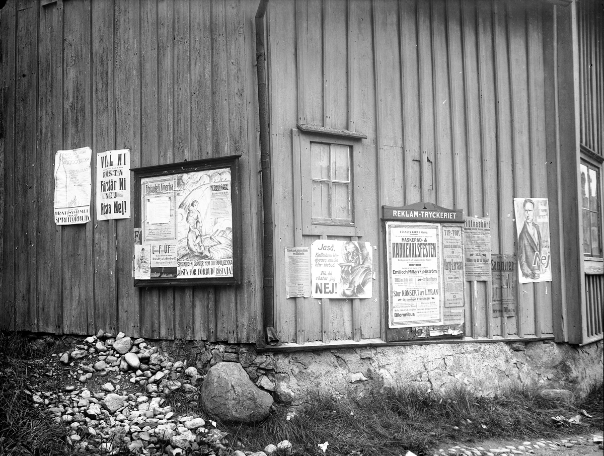 Dandernellska gården 1922 fungerade som annonshörna vid förbudsomröstningen samt för karneval i Folkets Park 26/8-27/8 1922. Fotograf: KJ. Österberg Fotokopia finns.