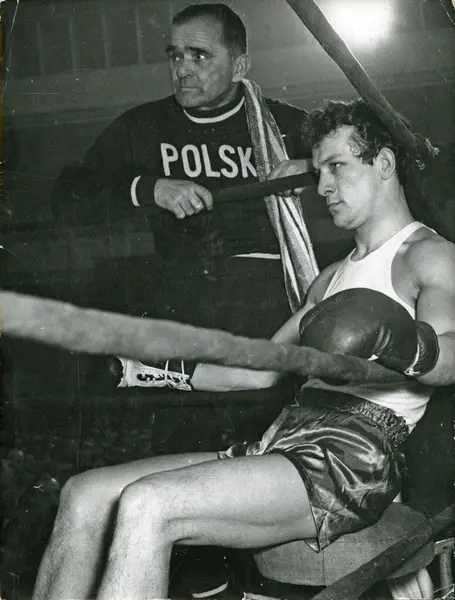 Del av material om Köpings Boxningsklubb. Matchbild Felix Stamm o Kazimierz Pazdzior.