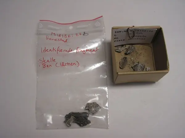 • Fragment av bränt ben. De identifierade delarna av fragmenten tillhör skalle och lårben.