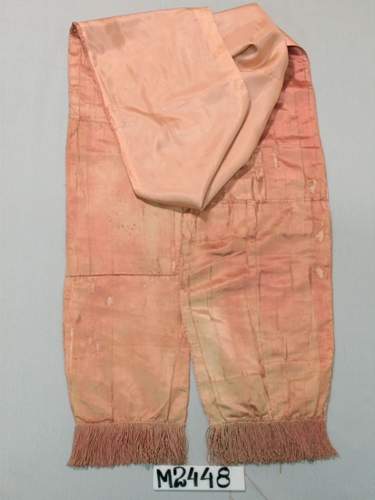 Skärp till hovdräkt av rött siden. I kortändar röd silkesfrans. Sidenet är skavt och har gamla insydda lappar. Har fått ett stödtyg av rosa siden, där de största skadorna är nedsydda med stora tydliga stygn. Frans L: 60 mm. Samhör ev. med kappa M 2445.
