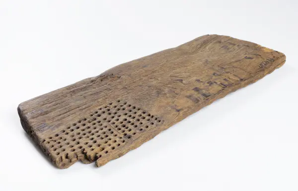 • Lusbräda av omålat trä. Ena sidan med borade hål i ena hörnet. Andra sidan med tvärsgående valkar, kan eventuellt även ha använts som tvättbräda.