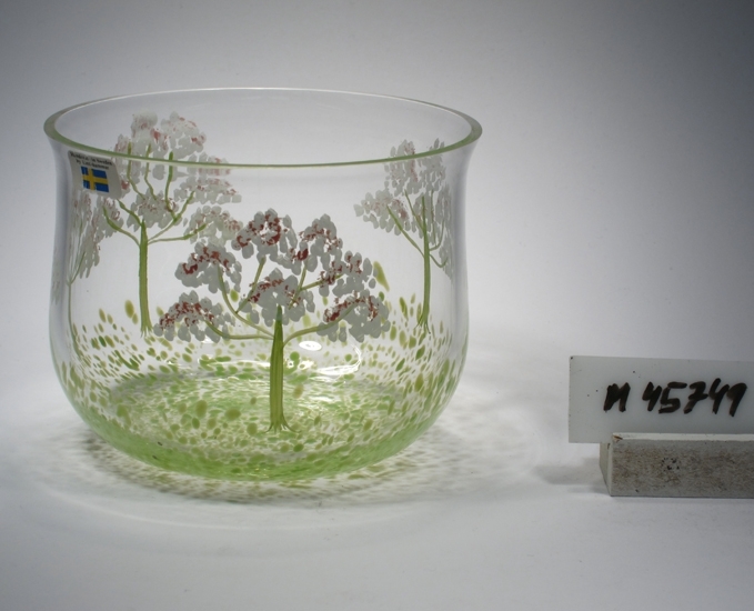Skål "Sommar" med tillhörande kartong. Art.nr. 3239. Formgiven av Catharina Åselius-Lidbeck. Idéskiss daterad 1979 finns i arkivet "Glasklart". Målad av F. W. Beskrivning: Klockformad, relativt hög. Slipad kant. Ivälsad kross i nedre delen. Emaljmålad dekor (bränns vid 500 grader). Dekoren består av grönprickiga kullar i nedre delen. Gröna träd med vit och rödbrun blomster målade i övre delen. Fä...