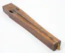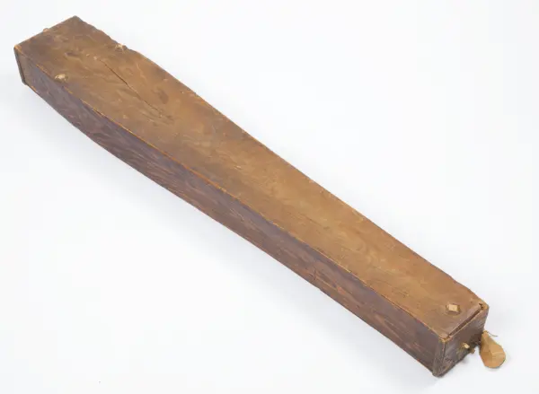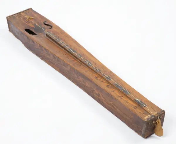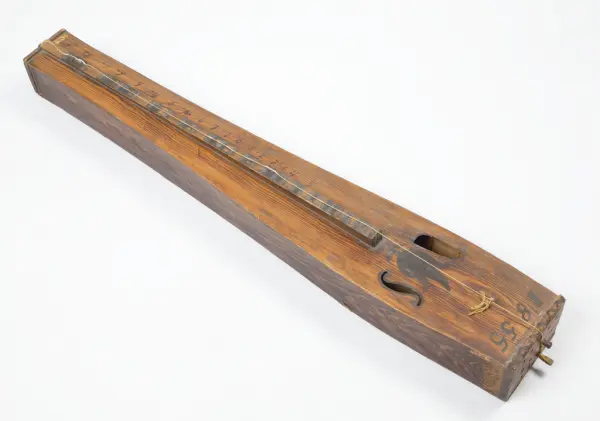 • Psalmodikon av trä med två S-formade ljudhål. Greppbrädan är upphöjd och försedd med trettioen greppband av metall, som är numrerade på locket bredvid greppbrädan. Instrumentet har haft en spelsträng av sena och sex par resonanssträngar av metall. Stämskruvar av trä. Bonad i brun färg samt målad blomma i svart mellan ljudhålen. Målad datering 1855.