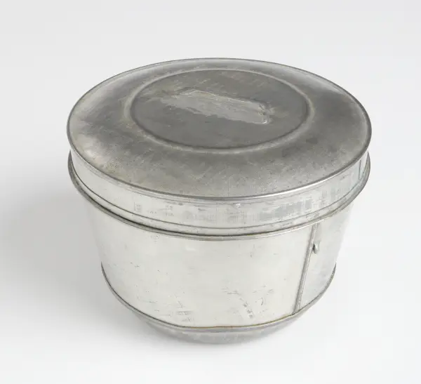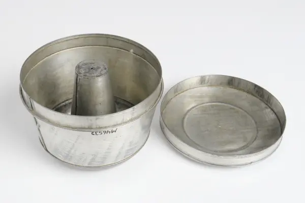 Form, tillverkad av förtennad bleckplåt. Den är rund och har en kon i mitten. Öppningen täcks av ett falsat lock. Själva formen är tillverkad i sektioner och lödd samman. Den har enligt uppgift använts till att tillverka sk. glassbomber i. Inköpt på auktion å Lidhems Säteri.