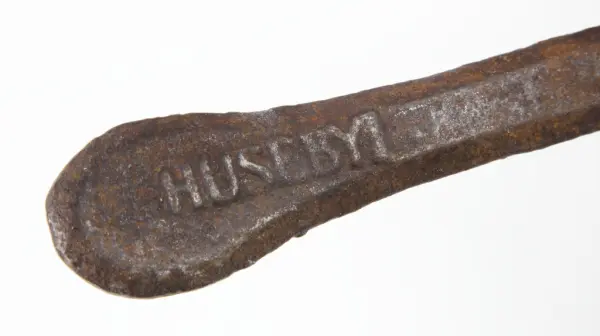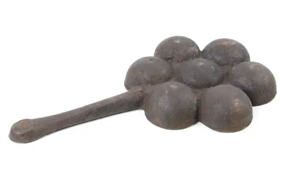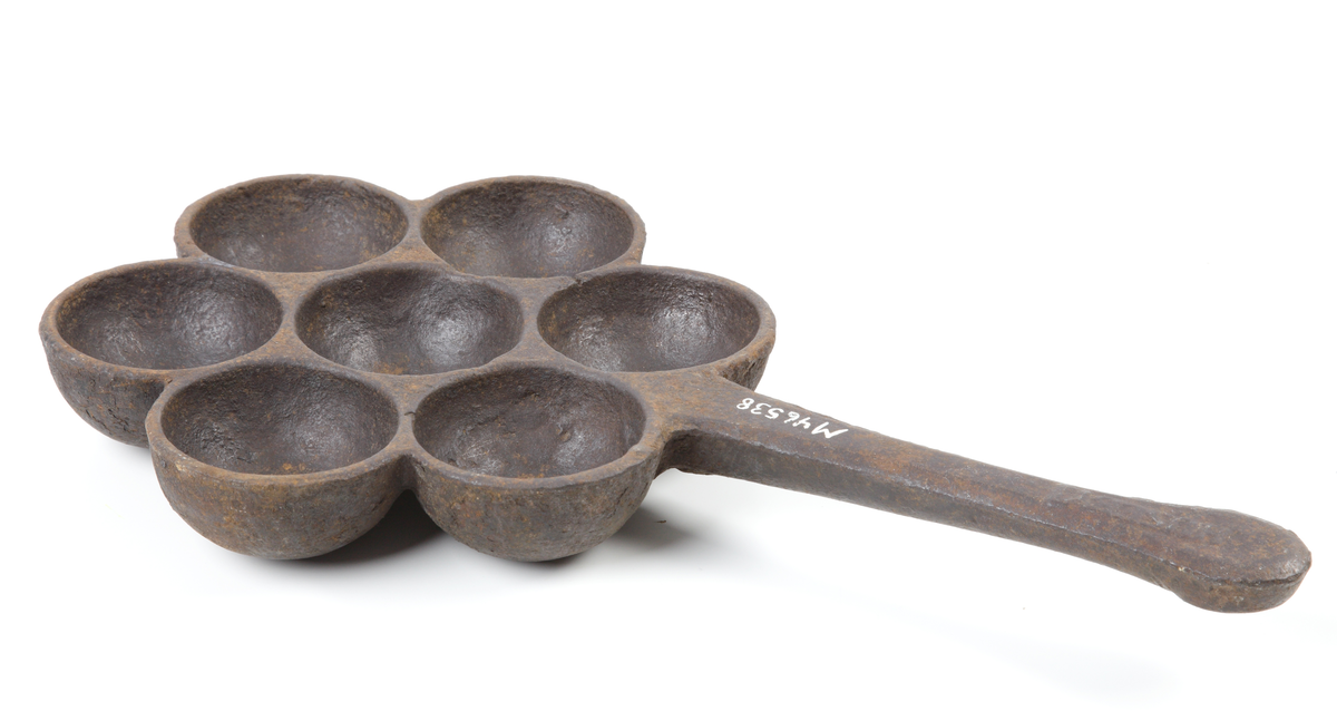 Pannan är avsedd att sättas direkt på glöden eller på ett tunt sk. brandjärn. Den har sju halvrunda fördjupningar där smeten skall gräddas, vidare har den ett långt platt skaft, bredare i ytteränden. Ovanpå skaftets yttre del finns namnet: se signering/ märkning. Givaren har funnit den 1982.