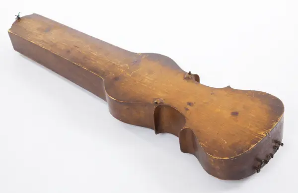 Fiolliknande psalmodikon av trä med två S-formade ljudhål. Greppbrädan är upphöjd och försedd med trettioen greppband av metall, som är numrerade från 1-7 plus och minus. Instrumentet har en intakt spelsträng av sena och fyra par resonanssträngar av metall. dessutom har intrumentet åtta strängar spända inuti klanglådan. Stämskruvar av trä. Står på tre små fötter.