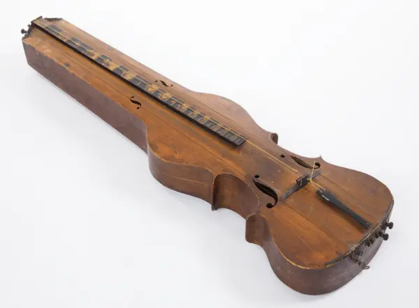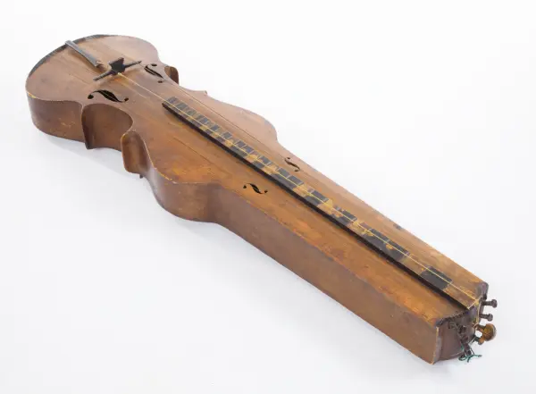 Fiolliknande psalmodikon av trä med två S-formade ljudhål. Greppbrädan är upphöjd och försedd med trettioen greppband av metall, som är numrerade från 1-7 plus och minus. Instrumentet har en intakt spelsträng av sena och fyra par resonanssträngar av metall. dessutom har intrumentet åtta strängar spända inuti klanglådan. Stämskruvar av trä. Står på tre små fötter.