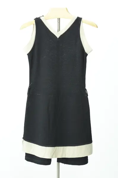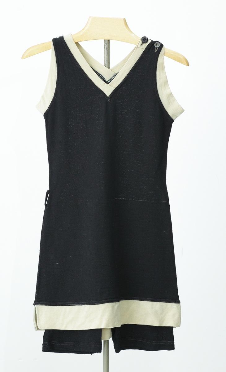 Baddräkt som varit del av innehållet i den koffert (M 48575:1) som Signe Karlsdotter, Långasjö socken, Kalmar län, tidigare Kronobergs län, hade med sig då hon återvände från Amerika till Sverige. Signe Karlsdotter, sedemera Karlsson, föddes 30/1-1897 i Brunamåla, Långasjö socken. Hennes förädrar hette Karl Oscar Gustavsson och Helena Svensdotter. Signe hade tre syskon som hette Edla, Karl-Erik o...