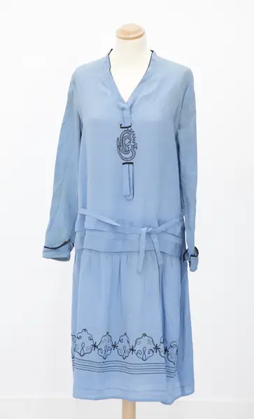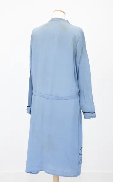 Klänning som varit del av innehållet i den koffert (M 48575:1) som Signe Karlsdotter, Långasjö socken, Kalmar län, tidigare Kronobergs län, hade med sig då hon återvände från Amerika till Sverige.