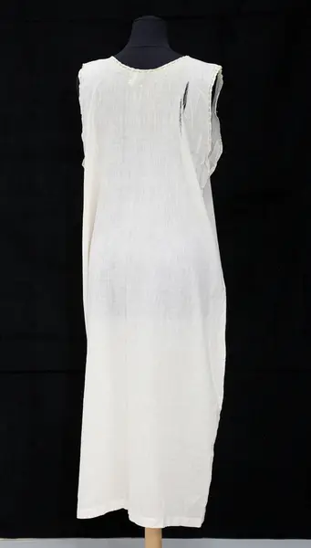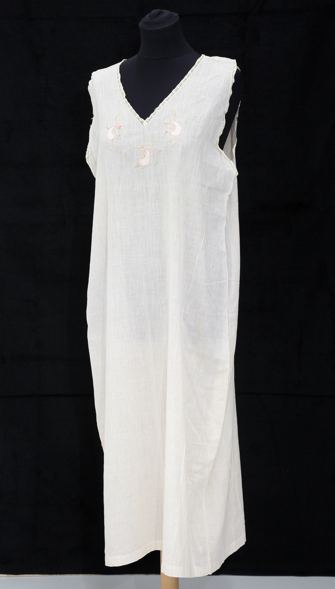 Linne som varit del av innehållet i den koffert (M 48575:1) som Signe Karlsdotter, Långasjö socken, Kalmar län, tidigare Kronobergs län, hade med sig då hon återvände från Amerika till Sverige. Signe Karlsdotter, sedemera Karlsson, föddes 30/1-1897 i Brunamåla, Långasjö socken. Hennes förädrar hette Karl Oscar Gustavsson och Helena Svensdotter. Signe hade tre syskon som hette Edla, Karl-Erik och Nanny. År 1908 flyttade Signe med familj till Brännebo, Elmeboda socken, numera Älmeboda. Hon gick i Källebäckens folkhögskola och konfirmerades i Elmeboda kyrka. När modern dog flyttade Signe, fadern och syskonen till systern Edla, gift med Ernst Karlsson i Ingemundebo. Byn ligger några km. från Moshult, mitt i utvandrarbygden. Signe utbildade sig till kallskänka på en hushållsskola i Karlskrona och arbetade sedan bl.a. på ett hotell i Växjö. Den 6/11-1919 emigrerade Signe till Amerika, närmare bestämt New York där hennes svågers tre syskon. Johan August, som emigrerade 1902, Amanda Charlotta som emigrerade 1902 och Alma Elise som emigrerade 1910, bodde. Charlotta hjälpte Signe att få plats i en familj där hon kunde arbeta som "kitchen-maid", köksbiträde. Under hela sin tid i Amerika fortsatte Signe att arbeta i olika familjer, mestadels i New York. Man kan se av hennes betyg att hon var mycket omtyckt. Så länge hennes far levde så skickade hon hem pengar till honom som lite hjälp. Signes syster Nanny emigredrade till Amerika år 1923, och hon arbetade också i hushåll i New York. Hon gifte sig med Sture Persson från Källeskruv i Ekeberga socken. 1933 åkte de hem till Sverige för gott och bosatte sig på Stures föräldragård i Källeskruv. År 1927 reste Signe hem till Ingemundebo, men återvände året därpå 1928 med Svenska Amerikalinjes "Gripsholm" till New York. Hennes "Immigrant Identification Card" visar detta från den tiden. 1946, efter 27 år i Amerika, kom Signe hem till Sverige. Hon bosatte sig hos svågern Ernst och systern Edla i Ingemundebo. När Signe återvände till Sverige så gjorde hon det utan att informera släktingarna i Sverige. Hon bara "damp" ner och kom gåendes på vägen. Denna koffert som hon då hade med sig från Amerika öppnades aldrig av henne i Sverige, och hon talade aldrig om Amerika. Hon var mycket förtegen om Amerika och vistelsen där. Hon visade aldrig innhållet för någon, och barnen som vistades i närheten ville gärna tala engelska med henne, men detta ville inte Signe göra. Givarens mor försökte tala om Amerika, men Signe bara gick över på ett annat ämne. Kofferten packades 1946 i Amerika och sedan packades den aldrig upp, utan bara förvarades. Släktingar tror att något kan ha hänt henne i Amerika, att hon lämnade något ledsamt, då hon bara dök upp en dag. Hon sågs som gudfruktig, och hon behöll sin barnatro. Hon var, trots åren i Amerika något skygg för folk hon inte kände. Vid hemkomsten vid 49 års ålder var hon behjälplig med hushållet och det som behövdes göra i Ingemundebo. Signes sista tid vistades hon på Emmaboda sjukhem, och hon ligger nu begraven på Långasjö kyrkogård sedan 1981 då hon dog. Kofferten stod oöppnad vid Signes död, och den bara stod och stod. Till slut ville syskonbarnen bara bli av med den, så man kontaktade museet och frågade om man ville ha en emigrantkista. Man förklarade hur det var, och att nyckeln saknades. Dåvarande avdelningschefen Lars Palm åkte och hämtade kofferten, detta 16 år efter Signes död. Kofferten öppnades först av personal på Smålands museum, av Lars Palm, som försiktigt slipade bort ett par nitar i låsfästet, och här öppnades då kofferten efter att ha packats i Amerika 50 år tidigare, 1947. Här fanns då allt som tvålar, glasögon, pass, biljetter, baddräkter, kjolar och klänningar m.m. m.m. Detta skedde när den kom som gåva 1997, där hela innehållet numera ingår i samlingarna på samma inventarienummer med undernummer. Signe Karlsdotter, sedemera Karlsson, var syster till givaren Peter Helmserssons farmor Edla, och uppgifterna här är lämnade 21/4-1997 av Helén Svahn, Ingemundebo, sambo med Peter Helmersson, boedne på gården Ingemundebo.