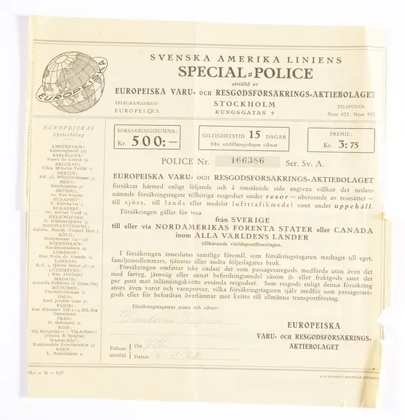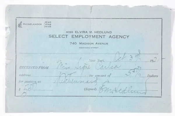 Dokument som varit del av innehållet i den koffert (M 48575:1) som Signe Karlsdotter, Långasjö socken, Kalmar län, tidigare Kronobergs län, hade med sig då hon återvände från Amerika till Sverige.
