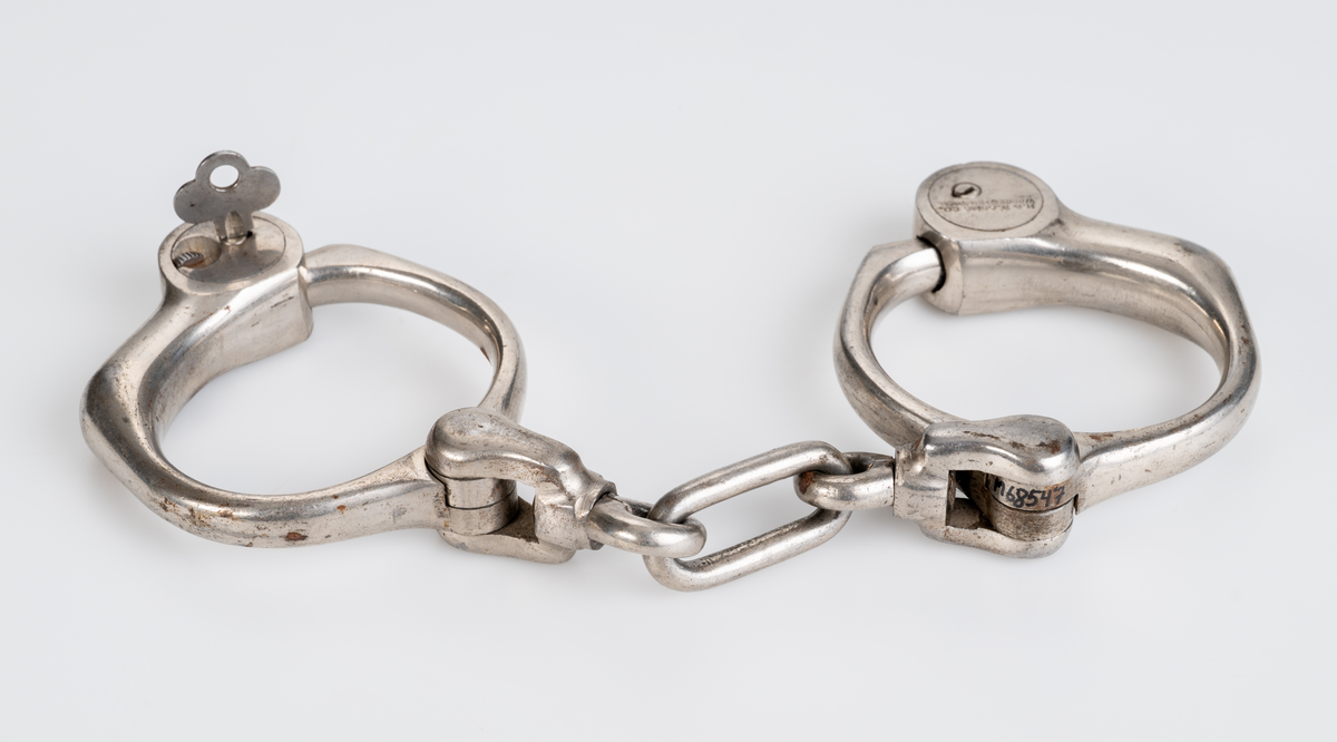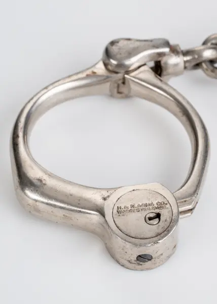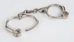 • Handbojor i förnicklat stål sammanbundna med en vridbar länk. Öppningen är något ovalt formad och båda handbojorna låses upp med nyckel, och förblir olåsta tills låsknappen vid låset trycks in. Man tr... Visa hela