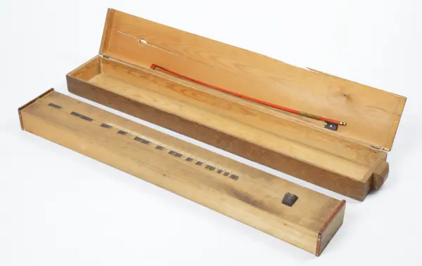• Psalmodikon av trä utan ljudhål, men har istället ingen botten. Stallet är limmat ovanpå locket. Strängen går igenom stallet och är fäst på undersidan med en mässingsknapp, i andra änden är den fäst med en enkel stämskruv av trä. Greppbrädan är något upphöjd och försedd med trettioen greppband numrerade upp till nitton. Förvaras i en trälåda tillsammans med stråke.