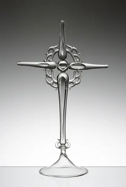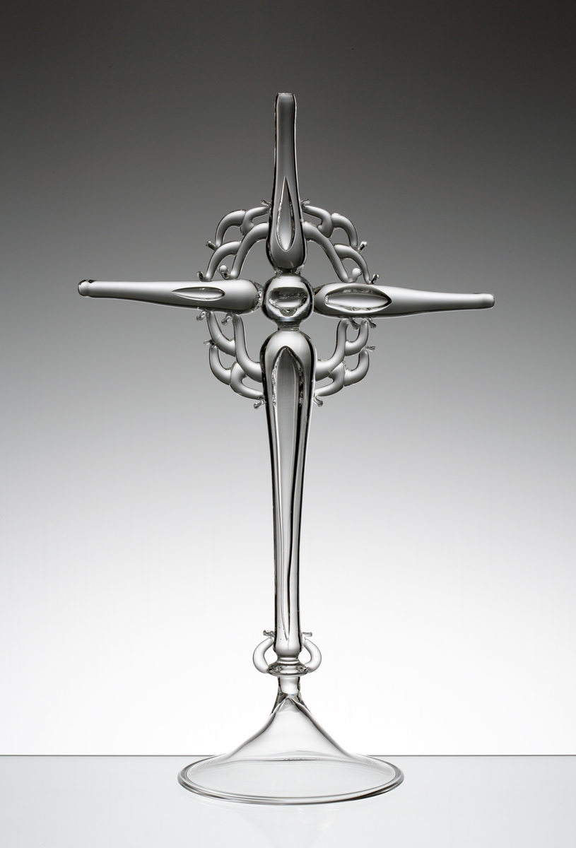 Formgivare: Nils Landberg. Altarkors tillhörande altaruppstats. Droppformade armar. Uppsvängd fot med omvikt kant. Luftblåsa i varje arm och i mittpartiet. Krans av glastrådar runt mittpartiet. Två öglor av glastrådar vid foten.