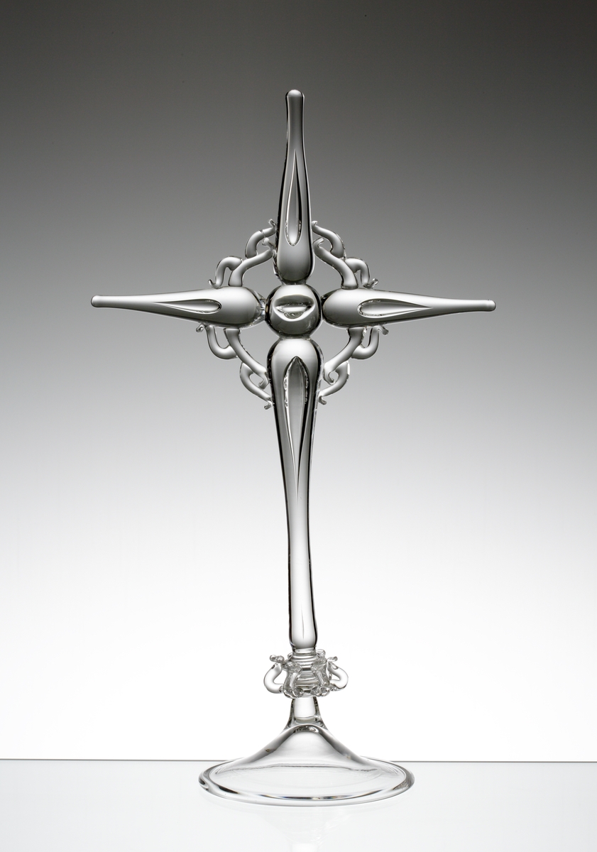 • Formgivare: Nils Landberg. Altarkors tillhörande altaruppstats. Droppformade armar. Uppsvängd fot med omvikt kant. Luftblåsa i varje arm och i mittpartiet. Krans av glastrådar runt mittpartiet. Två öglor av glastrådar vid foten.
