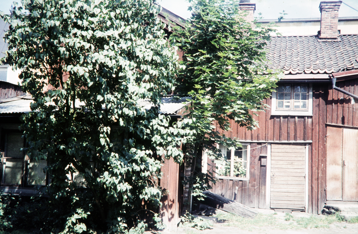 "Snus-Lundgrens" innergård vid Sandgärdsgatan. Färgfoto ca 1970.