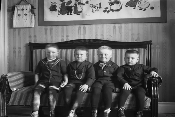 Rumsinteriör, fyra pojkar sitter i en soffa. Enligt de första uppgifterna är de första två okända, därefter Fridolf och Olof. Enligt kompletterande uppgifter från Marianne Kindgren, givarens släkting föreställer bilden: NN, Olle, NN och Lasse. Dessa anteckningar finns i faster Ruts album. (Fridolf, Mariannes far finns inte med på bilden). Det kan vara kusinerna Ramqvist, nr.1 och 3.