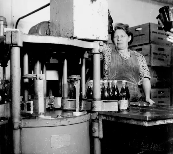 Zenks Bryggeri, interiör.Kontroll av tappningen vid tappningsmaskinen.Zenks bryggeri såldes 1950 till Norlings bryggeri, liksom Örebro bryggeri.