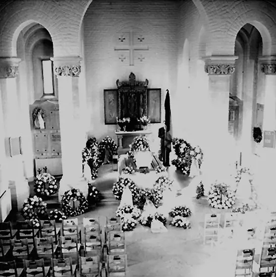 Vivi Karlbergs begravning, kyrkointeriör, begravningskista och begravningskransar.