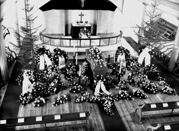 Kyrkointeriör (Trefaldighetskyrkan ?), begravning, likkista och begravningskransar.