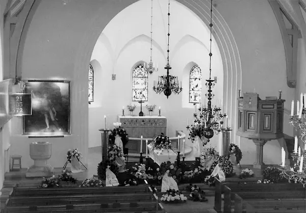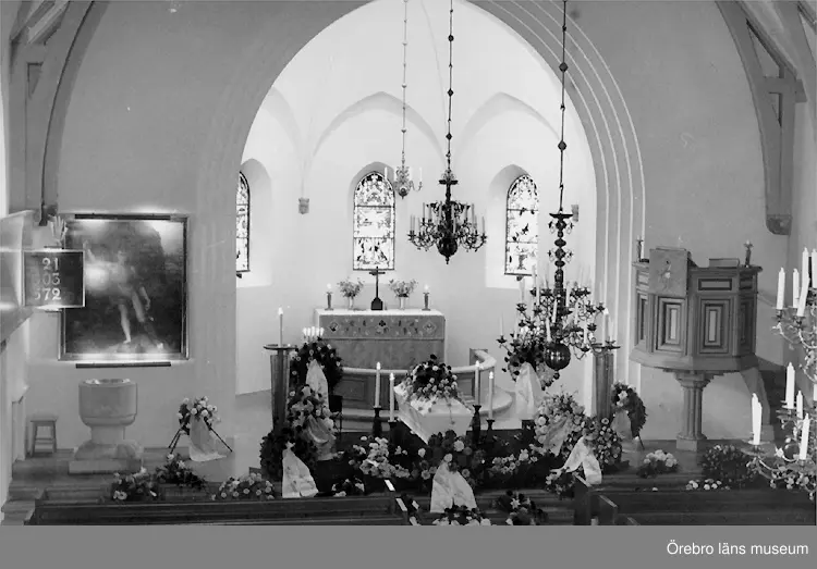 • Kyrkointeriör, begravning, likkista och begravningskransar.