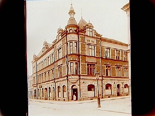Stenhus i tre våningar, fasad i rött tegel, ljus puts och sandsten. Präglas av nordeuropeisk renässans. Byggmästare Råhlén