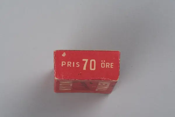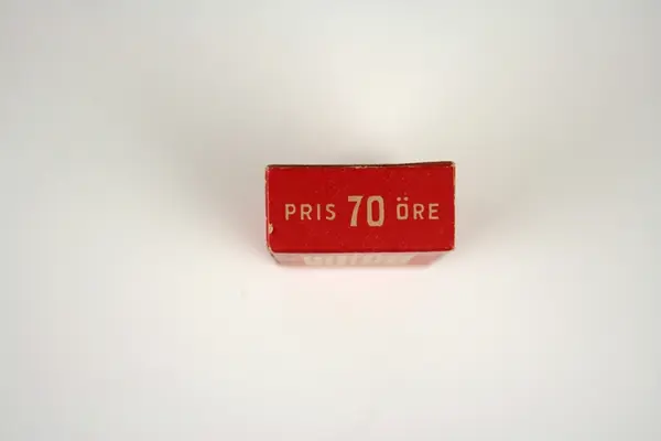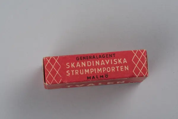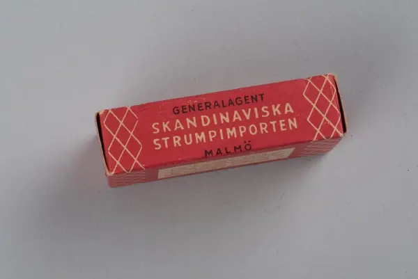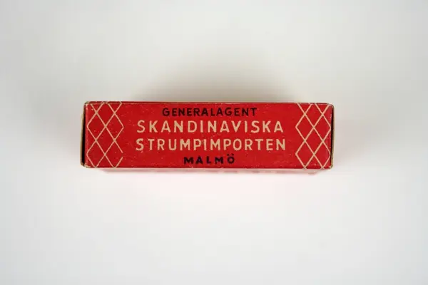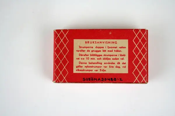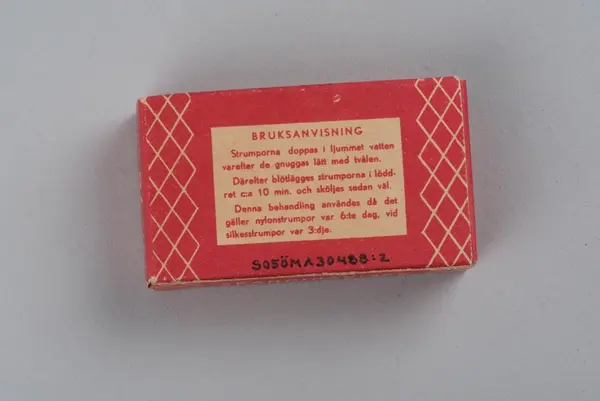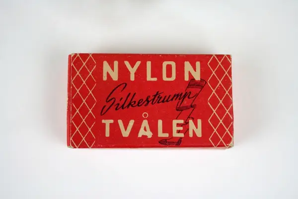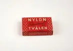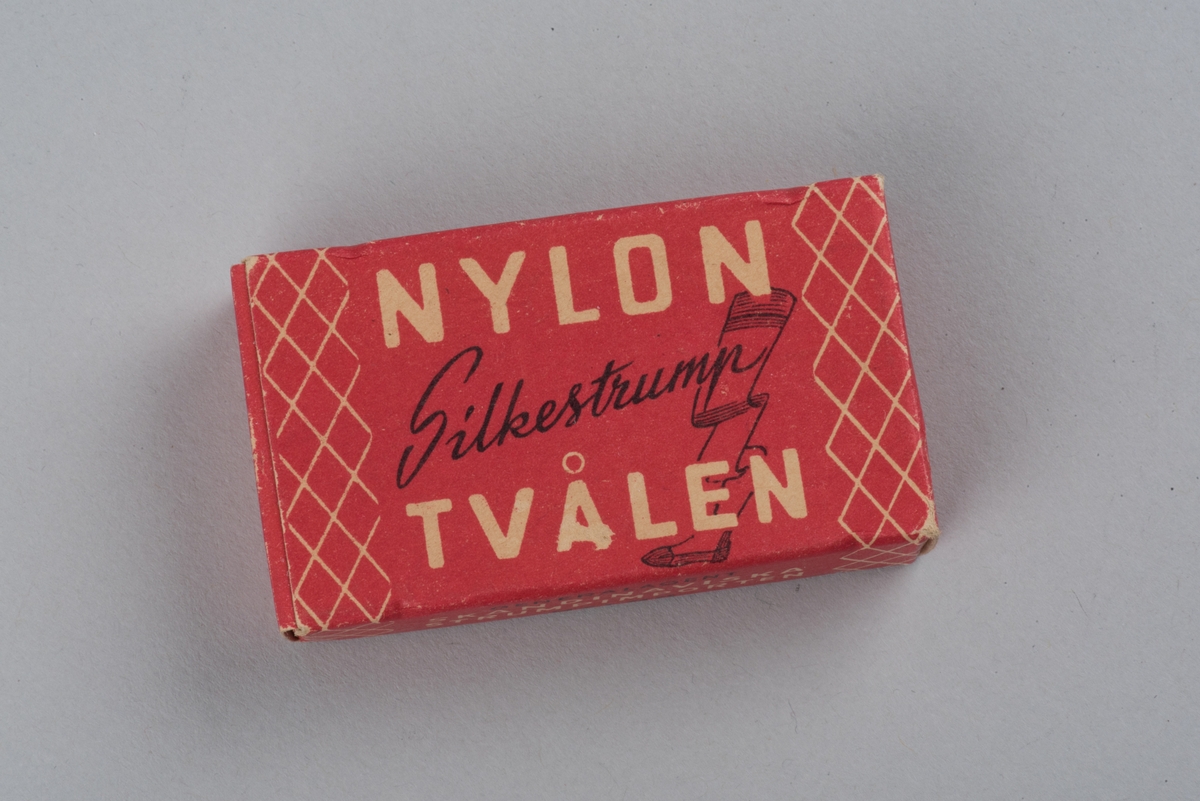 Tvål avsedd för tvätt av nylonstrumpor i originalförpackning. Tvålen består av gjuten tvålmassa med text i relief: NYLON SILKE. Pappersförpackningen är röd med rutmönster i beige och en tecknad silkesstrumpa i svart samt beige och svart text. På baksidan står en bruksanvisning.