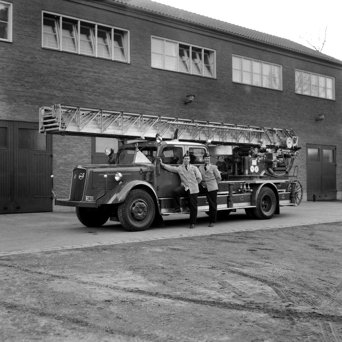 Muntra brandmän poserar invid stationens nya stegbil.