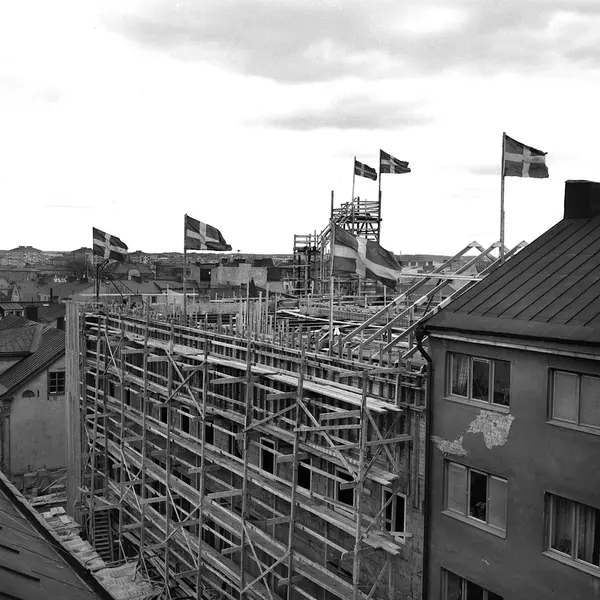 - Taklagsfest vid bygget av Tempo-husets förlängning 1956. Från 1930-talet hade en moderniseringen av miljön vid Nygatans centrala delar påbörjats. Med tillkomsten av bildens hus nådde nu strävan ned mot dagens Lilla torget.
