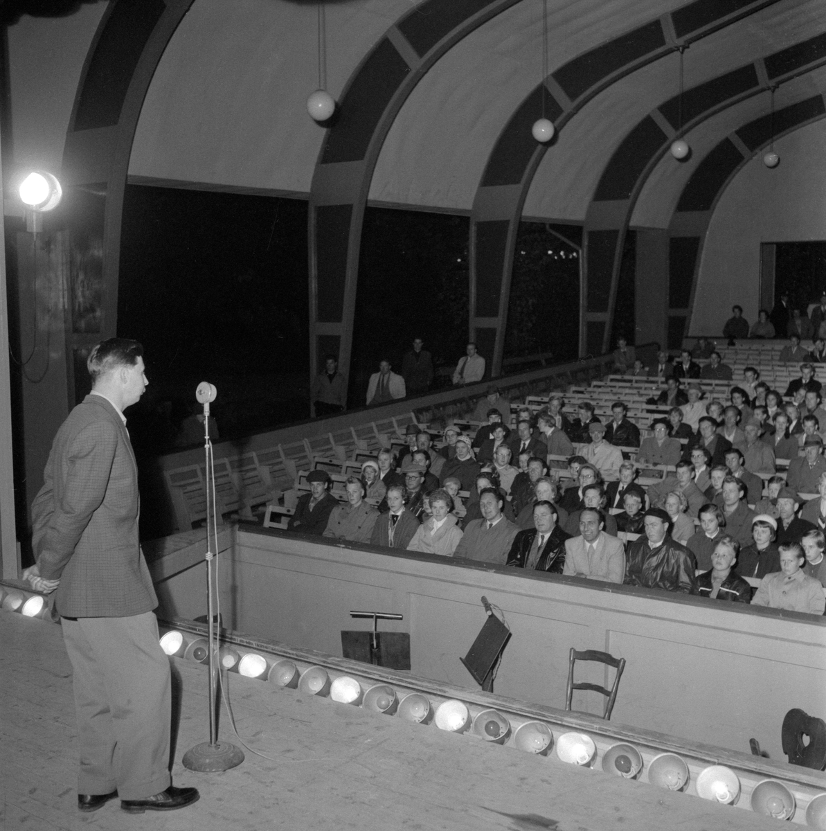Gösta "Snoddas" Nordgren under ett uppträdande i Åtvidabergs folkpark 1956. Scenframträdandet var en del av parkens stora festligheter under den första helgen i september. Utöver "Snoddas" uppträdde Sigge Wassbergs orkester från Malmö och Arne Bergelings från Linköping samt akrobatparet Asta och Allan. Hallbergs nöjestivoli erbjöd förutom karuseller även många kontinentala nöjesanordningar. Dessut...