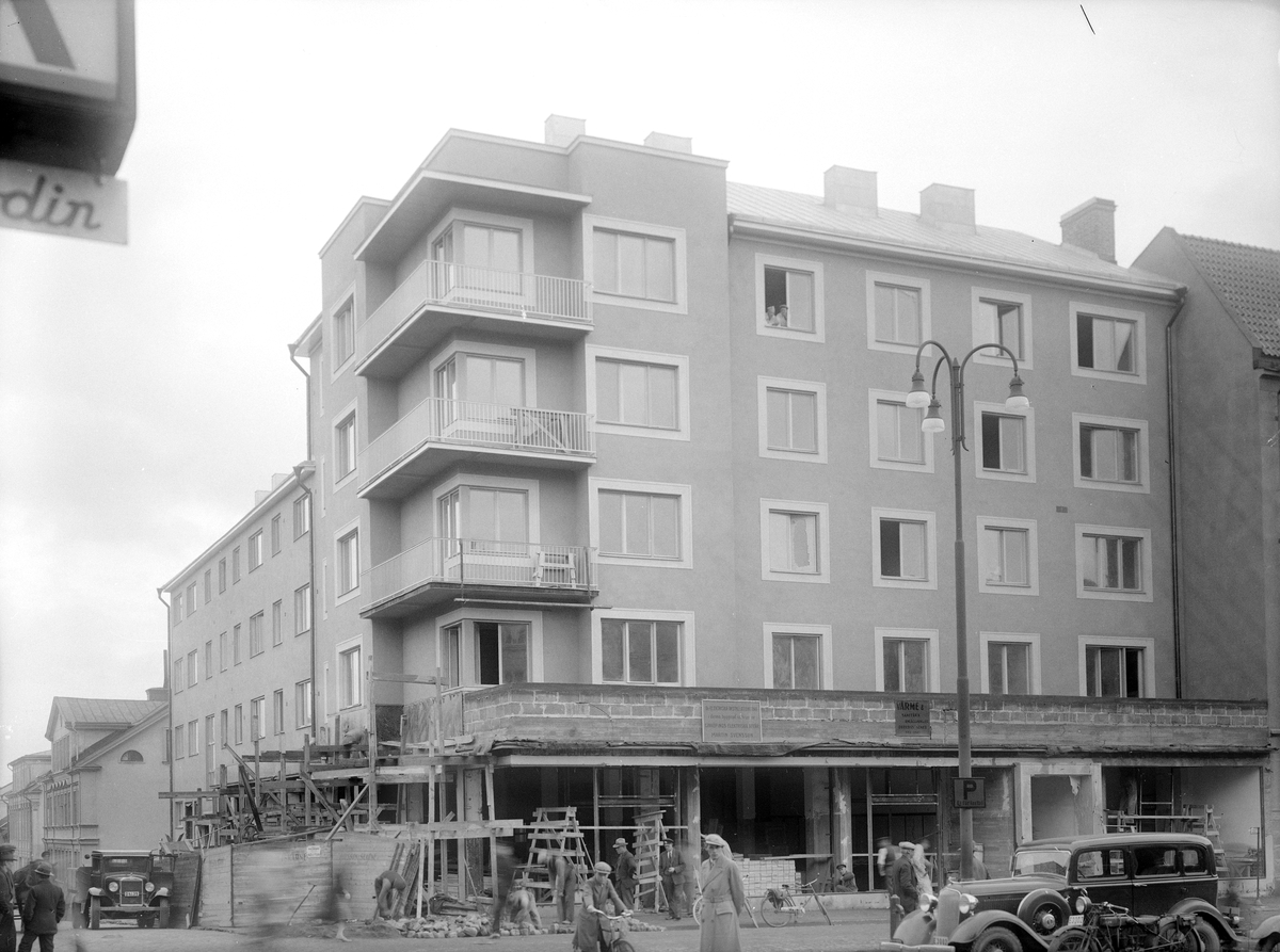 - Från mitten av 1920-talet och ett tiotal år framåt kom miljön kring Trädgårdstorget att närmast fullständigt förändras. Mot slutet av perioden var tiden mogen för sanering av kvarteret Doppingens nordvästra hörn. Efter arkitekt Björn Hedvalls ritningar lät byggföretaget Ohlsson & Skarne uppföra den affärs- och bostadsfastighet som i dagligt tal kom att kallas Tempo-huset. Huset får sägas vara ett typexempel på arkitektens funktionalistiska stil och det vardagliga namnet hämtades från Åhlén & Holms varuhus Tempo som från start och länge därefter var inrymt i gatuplanet. Här en bild kort före invigningen 1935.