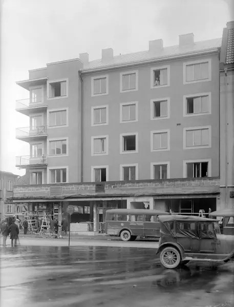 Tempo-huset i hörnet Sankt Larsgatan-Nygatan i Linköping tar form. Det vardagliga namnet hämtades från varuhuset Tempo som efter husets färdigställande och lång tid därefter var inrymt i gatuplanet. Varuhuset var Linköpings första av sitt slag, delvis med självbetjäning för snabba inköp i högt "tempo". Inspirationen hade ägarna i koncernen Åhlén & Holm hämtat från USA. Huset ritades av arkitekt Björn Hedvall och stod klart 1935.