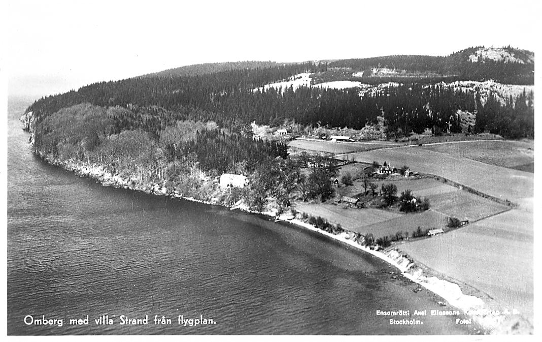 Flygbild över Omberg med villa Strand. Vykort.