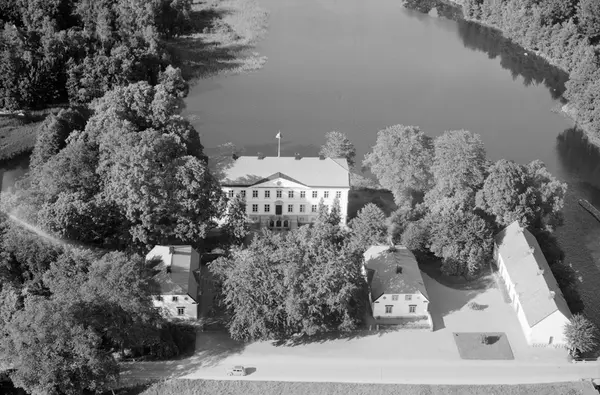 • Flygfoto över Brokinds slott 1954. Huvudbyggnaden var då nyligen restaurerad efter en förödande eldsvåda i oktober månad 1949.
