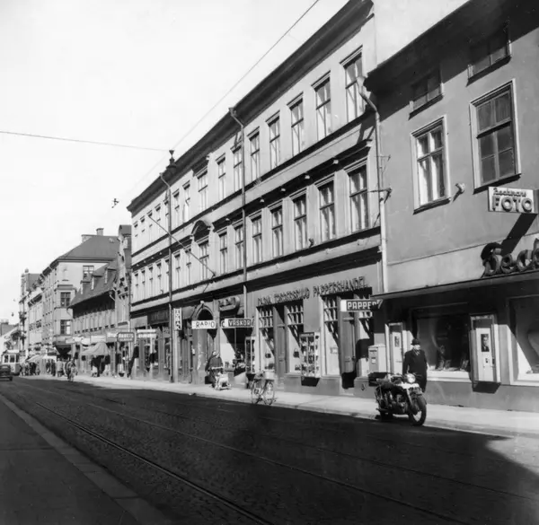 På femtiotalet, före 70- och 80-talens gatubreddning, var Kungsgatan en uttalad affärsgata och Ettans spårvagnslinje traffikerade fram till 1958 även denna del av staden. Kungsgatan var då uppdelad i norra och västra Kungsgatan med Bergsbron som avdelare. På bilden ses en del affärsgatan med butiker som Beckmans Foto, Toblers Frukt och Choklad, Köhlers Mode, Norra Päls - Hatt- & Mössaffären, Gran...