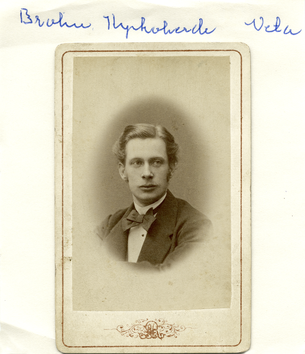 - Född som enda barn i ett enkelt skomakarhem i Norrköping fanns det utrymme för sonen att studera vidare. Det blev teologiska studier och därefter den så ofta långa vägen mot en fast prästtjänst. Ett första steg för August Wilhelm Brolin styrde till Tingstad som adjunkt i kyrkoherde Kastmans distrikt. Våren 1878 öppnades genom annans olycka möjlighet till avancemang. Komminster Julius Molander i Kaga hade avlidit och socknen var tillsvidare i behov av en vice. Brolins tid i Kaga blev emellertid kort. Redan året därpå blev tjänsten som vice pastor i Vårdsberg ledig och redan i februari månad 1879 var Brolin installerad i prästgården. Ett avgörande steg i Brolins karriär skulle komma 1882, då befordrad till ordinarie komminister i Viby socken. Känd och sannolikt respekterad i trakten kom han vidare år 1890 att erbjudas befattningen som kyrkoherde i det näraliggande Veta. Porträttet kan uppskattas till tiden omkring 1875.