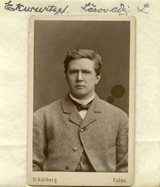 "Föräldrarne okände", så tvingades prästen i Motala inleda födelseattesten för gossen Hugo Fredrik efter nedkomsten den 2 november 1851. Modern hade en tid före barnets födsel inackorderat sig hos barnmorskan Aurell, men inte uppgivit sitt namn. Trots de till det yttre sparsamma omständigheterna hade det till barnets dop samlats en rad prominenta faddrar; civilingenjören N. Fröding, apotekaren A. Landin och medicine doktor N. Ekwurtzel med flera. Gossen skulle genom livet bära den sistnämnde fadderns efternamn, men sakförhållandet har inte utretts för denna presentation. Vi finner honom efter födseln först i 30-årsåldern som inflyttad från Stockholm till Linköping. Det tycks gått honom materiellt väl, ty i sin nya hemstad tillträdde han en tjänst som läroverksadjunkt. Hans liv blev dock kort. Han avled redan vid 32 års ålder. Fotografiet kan dateras genom fotografen Daniel Kihlbergs verksamhetstid i Falun. Upplysningsvis hade densamme varit verksam i Linköping under åren 1878-1880.
