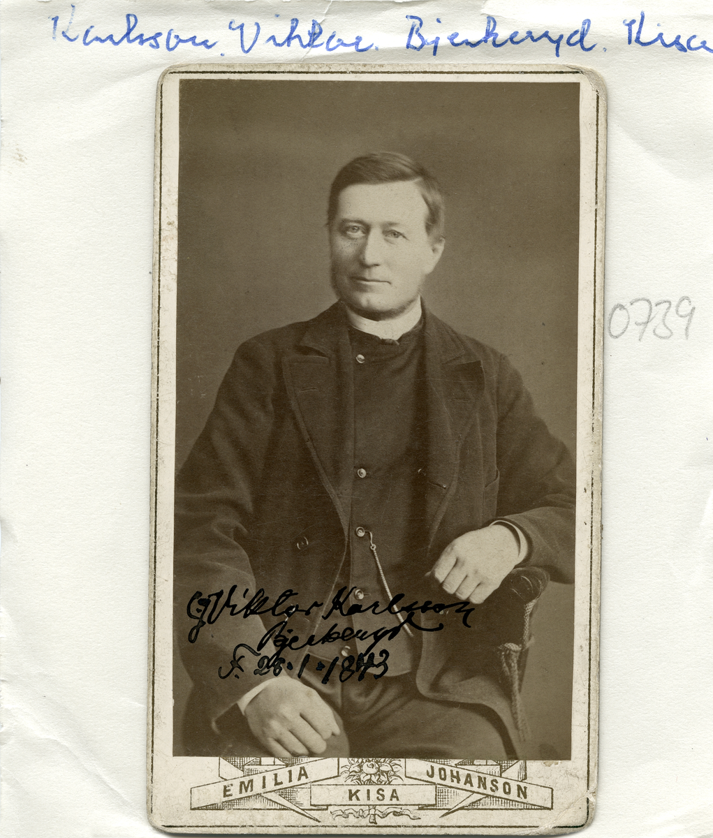 Från sin tidiga etablering och långa verksamhetstid som fotograf i Kisa kom Emilia Johanson att porträttera otaliga Kindabor. Merparten av de förevigade personerna kan vi förmoda ha fallit in i anonymitet över åren, andra kan väckas till liv genom påskrifter av dem som ännu mindes. Som här där vi möter hemmansägaren Viktor Karlsson som från 1875 och tillsammans med hustrun Anna Greta Jacobsdotter ägde och brukade del i Bjärkeryd Södergård söder om Kisa. I sitt livs begynnelse född 1843 i Vimantorp väster om Kisa där föräldrarna ägde ett mindre hemman. I vuxen ålder kom han i förstone att ensam arrendera en bruksenhet i byn tills han från 1866 blev rättare på den större gården Kvarntorp, även den belägen väster om Kisa. Året därpå gift med ovannämnda Anna Greta. Fotografiet kan antas tillkommit vid 1870-talets senare hälft.