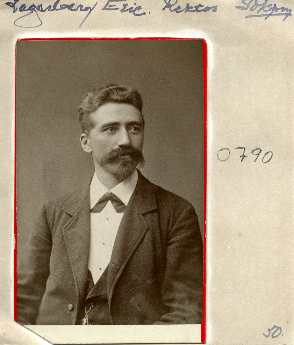 - Erik Lagerberg visar exempel på att en social resa i allt högre grad blev möjlig under 1800-talet. Född i Regna 1847 som oäkta son till en hemmadotter i en mindre gård, blott 7/45 hemman. Modern gifte sig efterhand med en torparson från orten och paret blev del i hennes föräldrahem. Deras första tre gemensamma barn dog i späd ålder och familjen tycks delat samma förutbestämnda öde som de flesta med små resurser. Paret reste sig dock och kom efterhand att arrendera relativt stora gårdar, bland annat församlingens kyrkoherdeboställe. I detta lyckades Erik få studera och efter examen i filosofiska ämnen återfinns han från 1881 som vice lektor vid Linköpings läroverk. Från höstterminen 1885 var han i tjänst som tillförordnad rektor vid läroverket i Söderköping och vidare som ordinarie rektor vid lärosätet i Eksjö. Från 1881 gift med Anna Agata Eleonora Åkerblom. Här porträtterad omkring 1885.