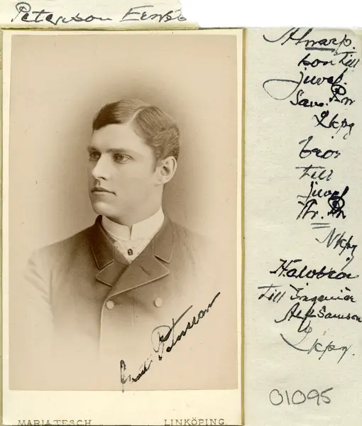 • Porträtt av ingenjör Ernst Petersson. Född i Linköping 1861 och son till guldsmedsmästare Samuel Petersson och dennes hustru Helena Christina Carlson. Gift 1891 med Jenny Ottilia Johansson. Från 1896 ... Visa hela