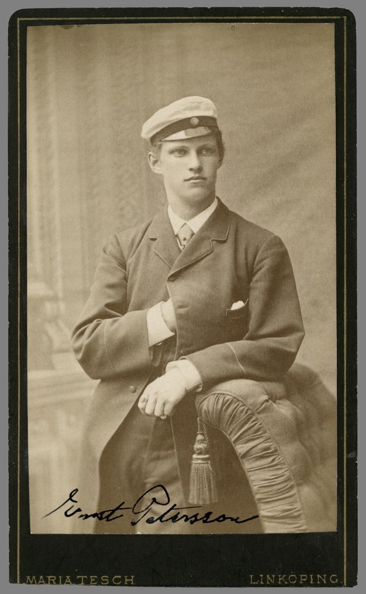 Studentporträtt av Ernst Petersson. Född i Linköping 1861 och son till guldsmedsmästare Samuel Petersson och dennes hustru Helena Christina Carlson. Vidare gift 1891 med Jenny Ottilia Johansson. Från 1896 var de bosatta i Ultuna där han kom att bli lektor i mejerilära och bakteriologi och kemi vid lantbruksinstitutet. |