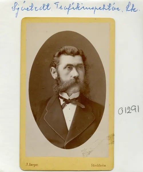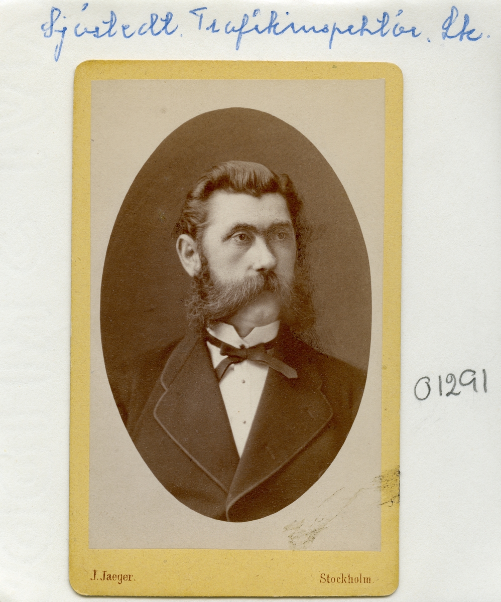 Porträtt av trafikdirektör Adolf Valentin Sjöstedt. Född i Skara 1833 inflyttade han till Linköping vid årsskiftet 1874-75. Med sig hade han sonen Erik Valentin från ett kortvarigt äktenskap som fått sitt slut när makan avlidit kort efter sonens födelse. I förstone bodde Sjöstedt med sonen i Linköpings stationshus men flyttade till en våning på Kungsgatan i samband med nytt äktenskap 1883. Hans an...