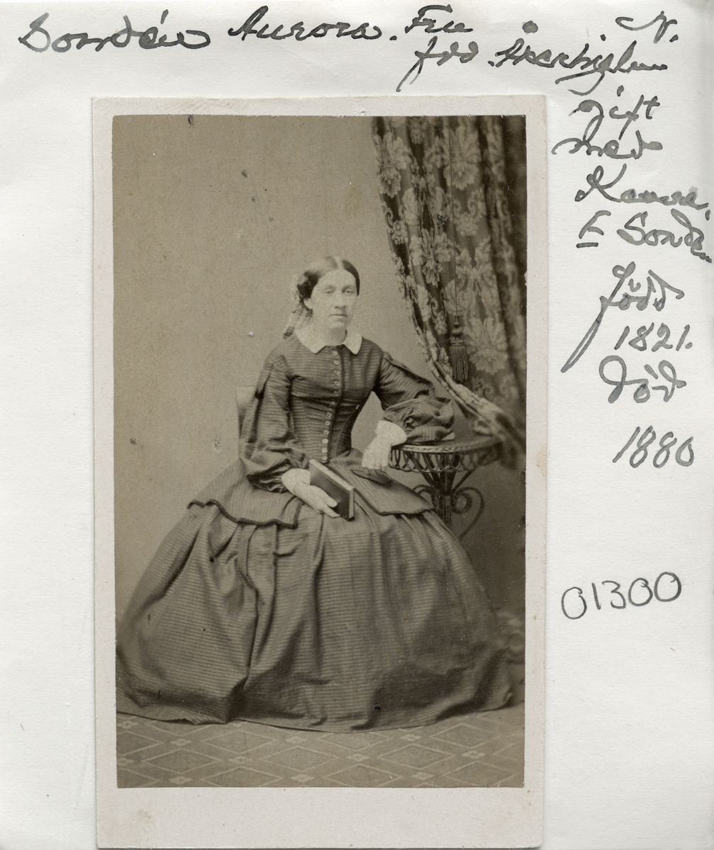 Av tiden gulnat porträtt av fru Aurora Åkerhielm. Född 1821 på godset Munkvrak, nuvarande Hjälmarsholm, som dotter till baron Eric Georg Philip Åkerhielm och dennes maka friherrinnan Henriette Sofia Juliana Lagercrantz. Från våren 1833 var familjen bosatt i Vårdsbergs säteri i östgötasocknen med samma förled för att år 1835 flytta till Askeby. Under perioden i Vårdsberg avled modern i sviterna av förmodad nervfeber. I övre tonåren inledde Aurora, som del i förväntad uppforstran av tidens adelsfröknar, en rad vistelser hos respekterade familjer i länet. Makarna Stockenström/ Söderholm tog en tid mot henne i Landeryd följt av Horn/von Schewen i Söderköping. Från 1844 hittar vi henne hos komminister Westerdahl i Hällestad för vidare boenden hos makarna Linzon/Berndes i västgötska Hova följt av en sejour hos godsägare Hedengren med maka på Riseberga säteri i Närke. Hennes sista stopp på bildningsresan blev i gruvkassör Nordströms hushåll i uppländska Film socken åtföljt av en kortare tid hos kyrkoherde Schram i Vendel. I april månad år 1856 inflyttade Aurora till Ekebyborna socken i Östergötland. Om inte förr blir skälet tydligt redan vid midsommartid då hon gifter sig med Erik Sondén, som vid tiden arrenderade Egeby södergård. Från år 1860 var paret emellertid bosatta i Norrköping där maken tjänstgjorde som inspektor vid stadens spinnhus (kvinnofängelse) och senare som kamrer vid Drags fabriker.