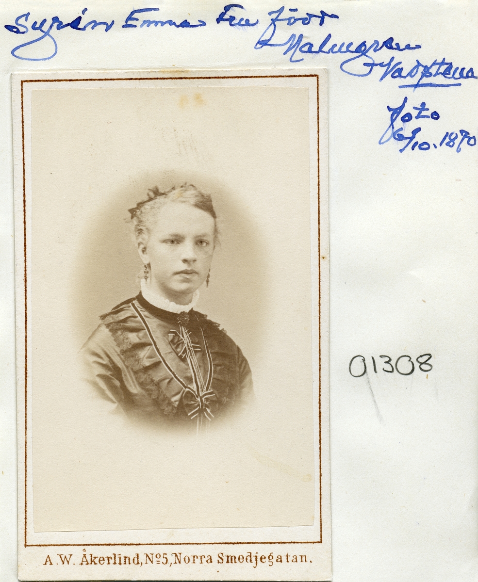 - Ungdomsporträtt av Emma Malmgren. Född och uppvuxen i Vadstena som dotter till handlaren Carl Olof Malmgren och hustrun Ulrika Eleonora Gylling. Efter en tid i Stockholm återvände hon år 1888 till föräldrahemmet i Vadstena för att senare under året flytta till Rogslösa i samband med hennes giftemål med fanjunkaren Gustaf Ludvig Syrén. Makarna bodde i förstone i Borghamn men flyttade till Vadstena under hösten 1895. Efter ett tiotal år i Vadstena bröt paret upp för ny tillvaro i Linköping. I den nya staden kom de att bo invid Djurgårdsgatan i det område vid gatans nedre, östra sida som vid tiden benämndes Erikslund. Den 15 år äldre maken hade efterhand stigit till underlöjtnants grad men var nu pensionerad och möjligtvis sjuklig. I mars månad 1912 avled han av hjärtsvikt.